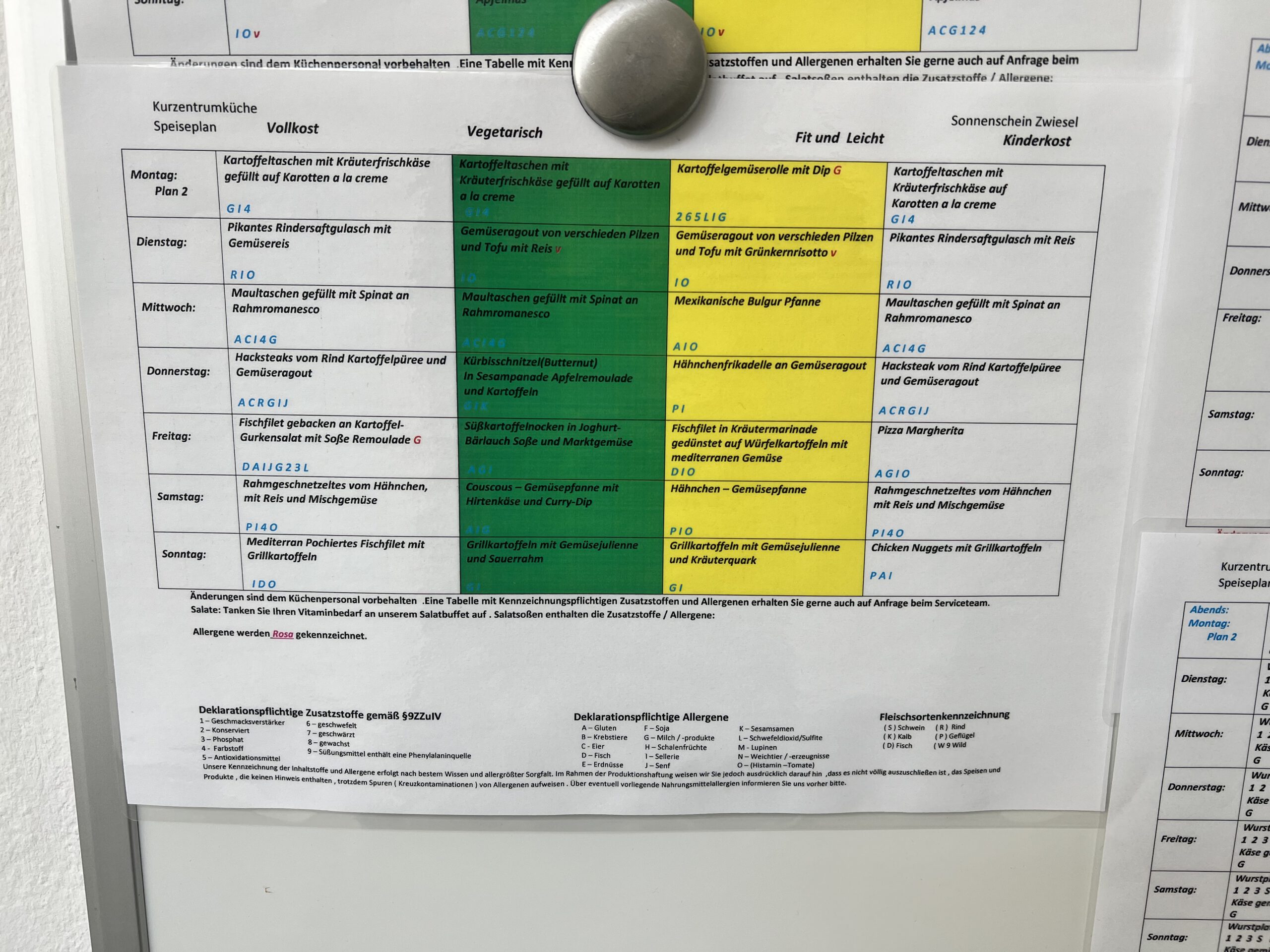 Beim Essen gibt es zwei Durchgänge. Der erste Durchgang startet um 7:00 Uhr, 11:30 Uhr und 17:00 Uhr. Der zweite um 08:15 Uhr, 12:30 Uhr und 18:15 Uhr.