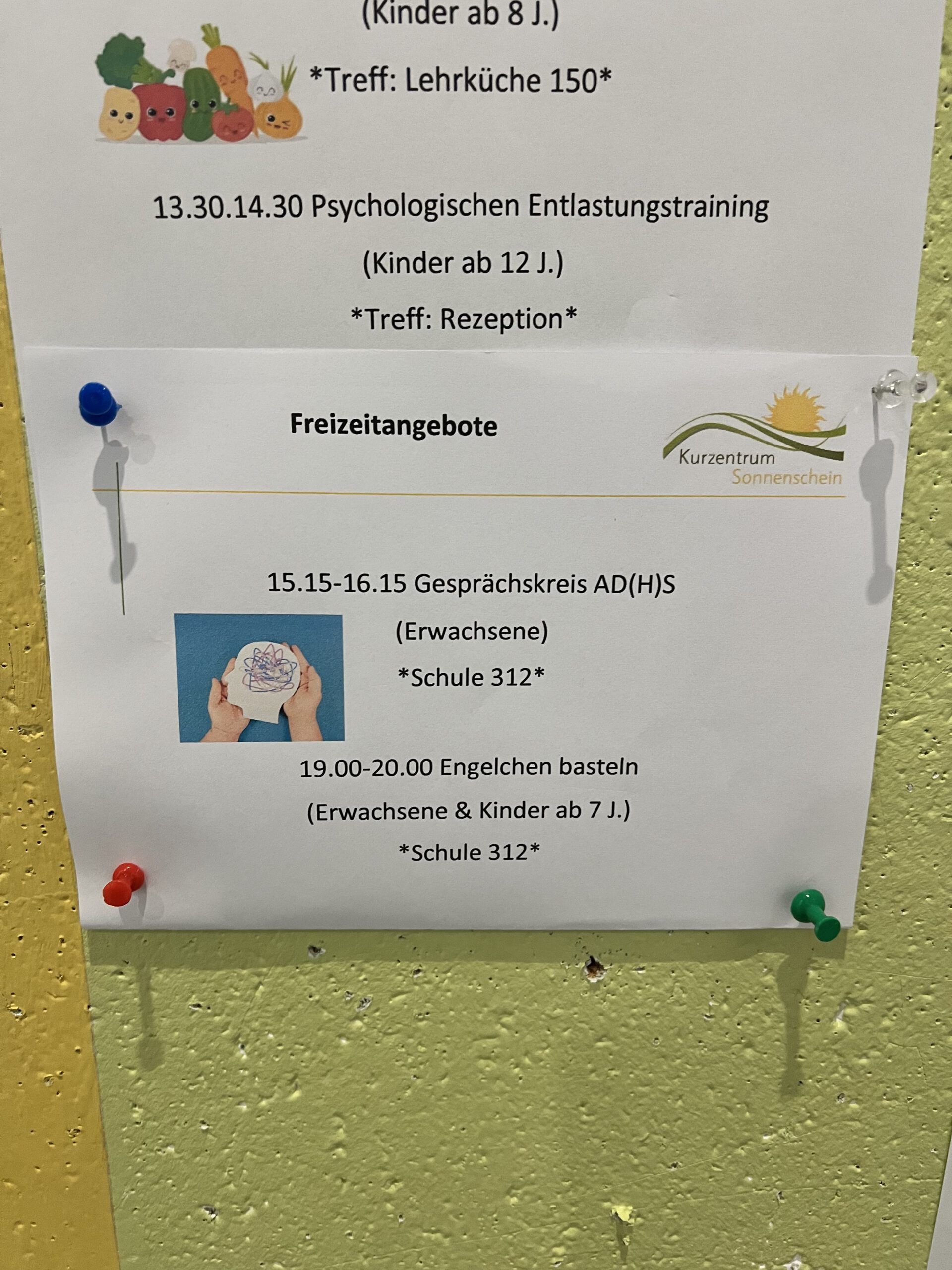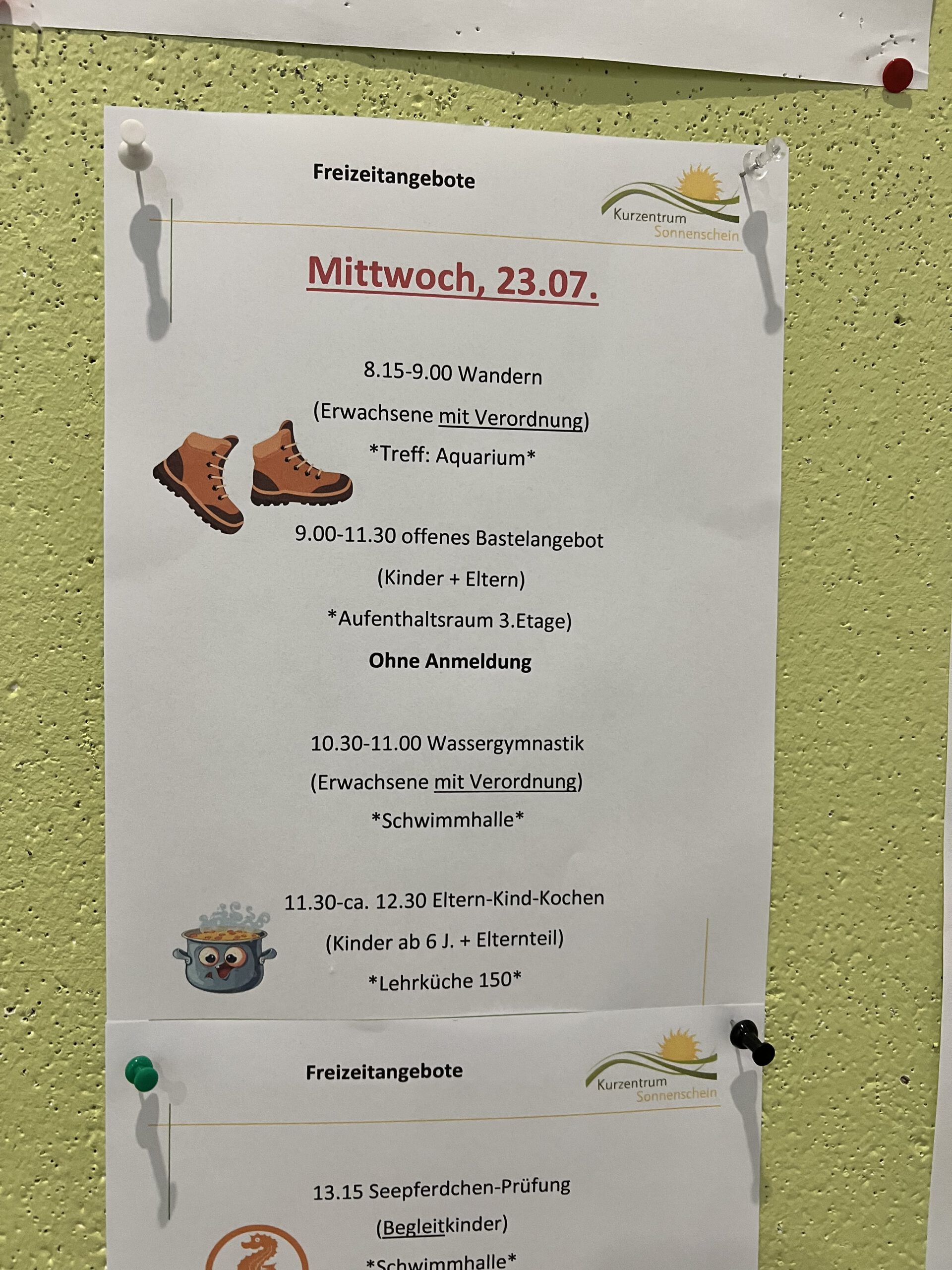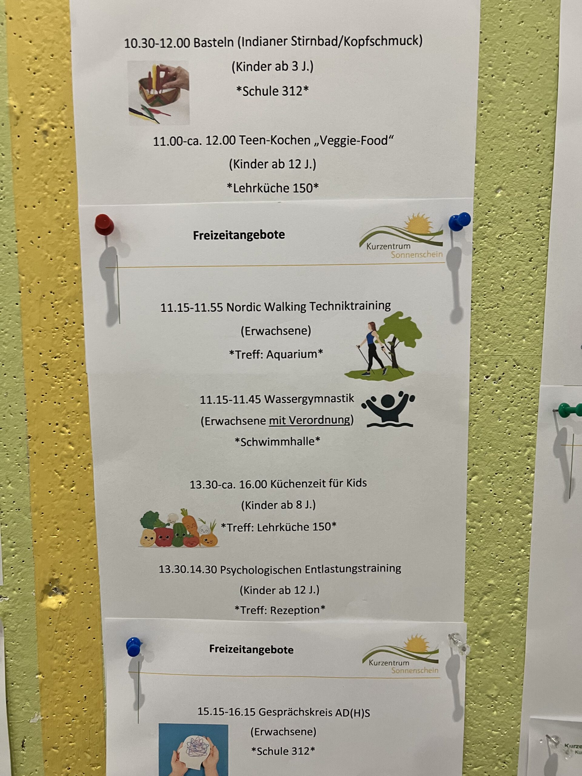 Neben den Therapieterminen, welche die Klinik immer freitags zur Verfügung stellt, gibt es an der Rezeption noch einen Ordner mit weiteren Möglichkeiten an Wassergymnastik, Wandern, Ponyreiten, Kutschfahrten, Kinobesuche mit der Betreuung, Bastelangeboten etc. teilzunehmen.